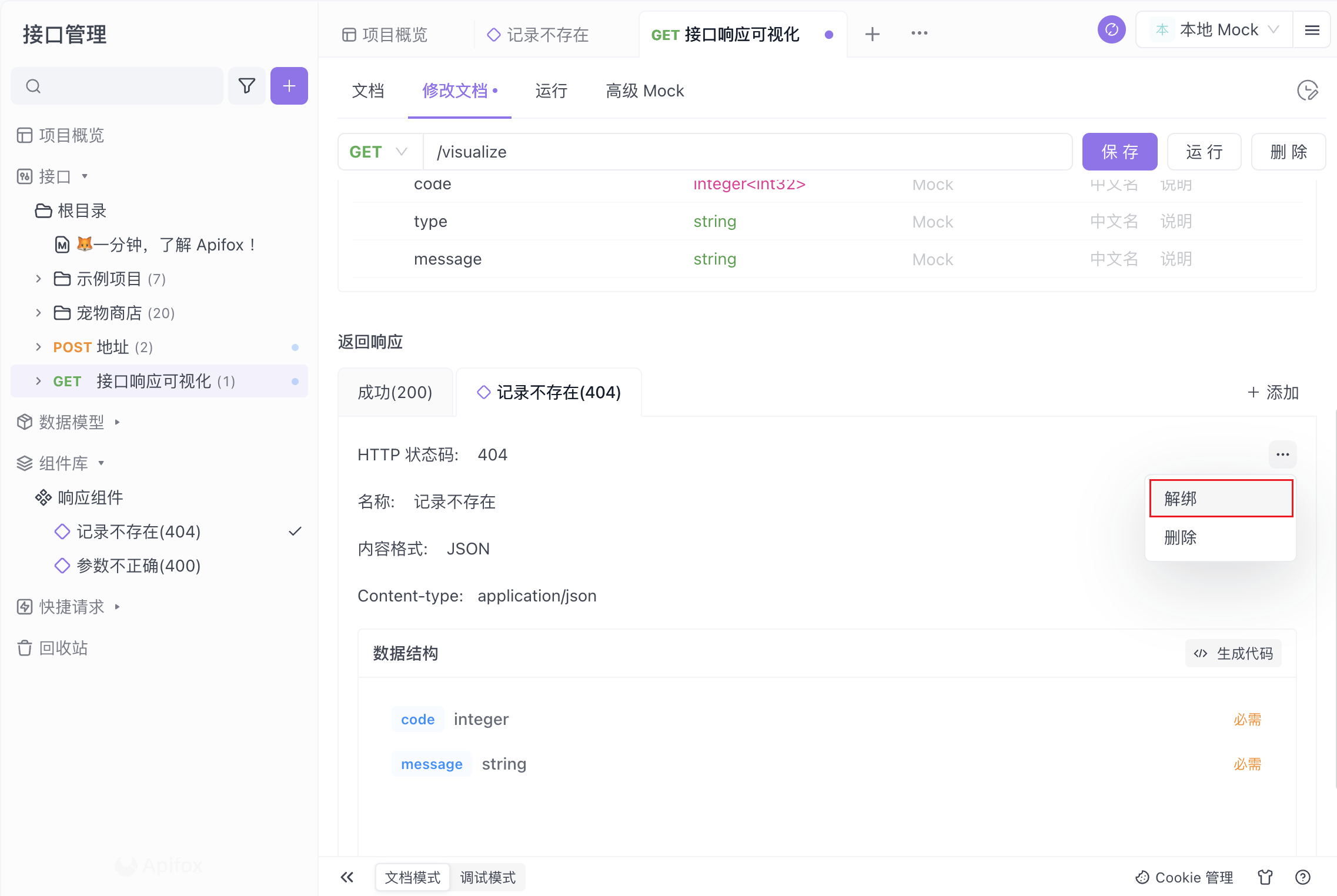 若你需要单独针对某个接口的响应组件进行自定义调整,需要点击右侧的 ··· 按钮,轻点「解绑」后即可单独调整。
