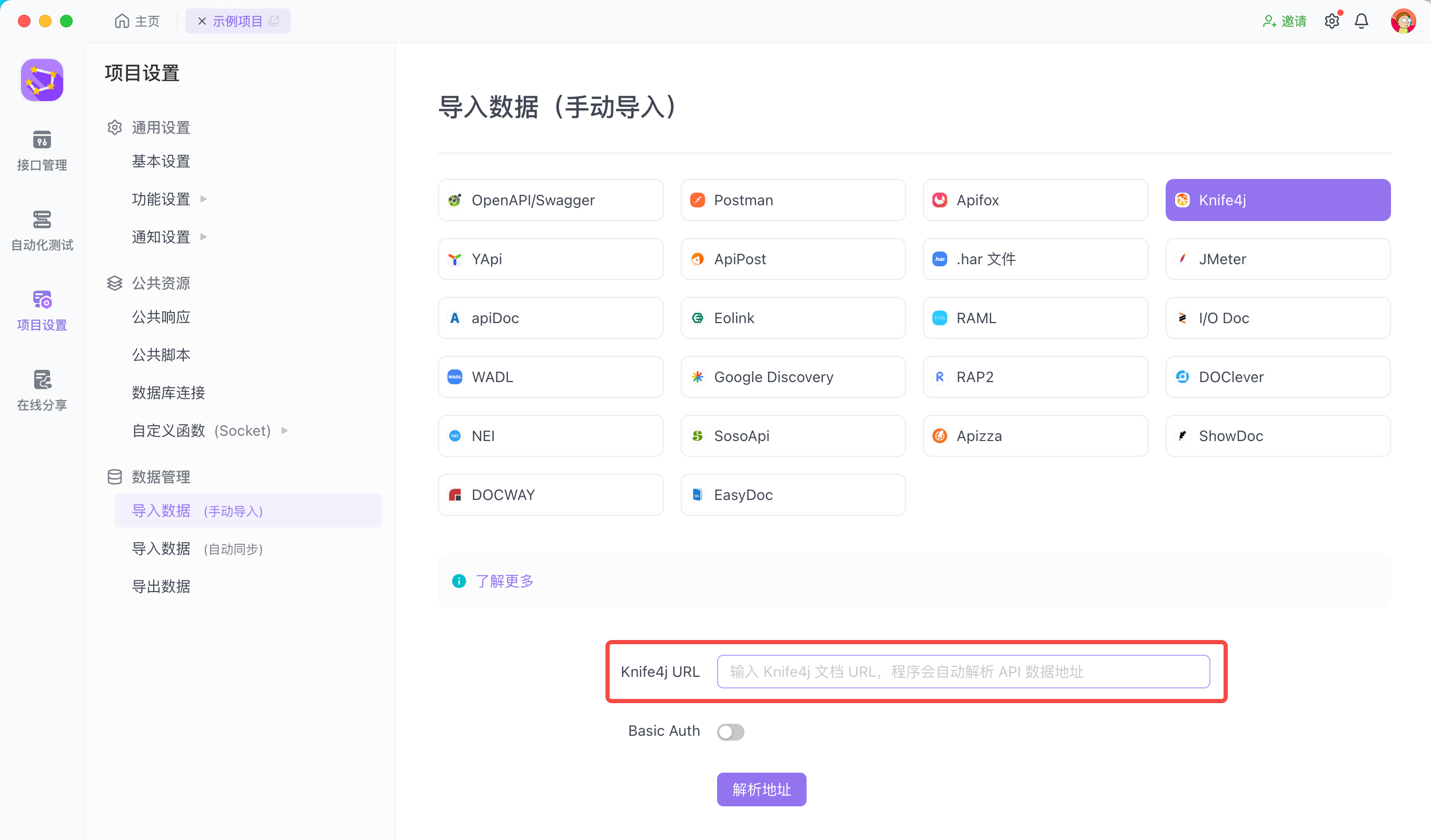 导入 / 导出接口导入接口导入 Knife4j本页总览导入 knife4j导出数据直接复制 Knife4j 的 URL,如图:导入数据打开 Apifox 中的“项目设置”面板,点击手动导入,选择 knife4j 并粘贴 URL 进行解析。在解析地址中选择需要的数据源(导入时只能选择一个数据源)。