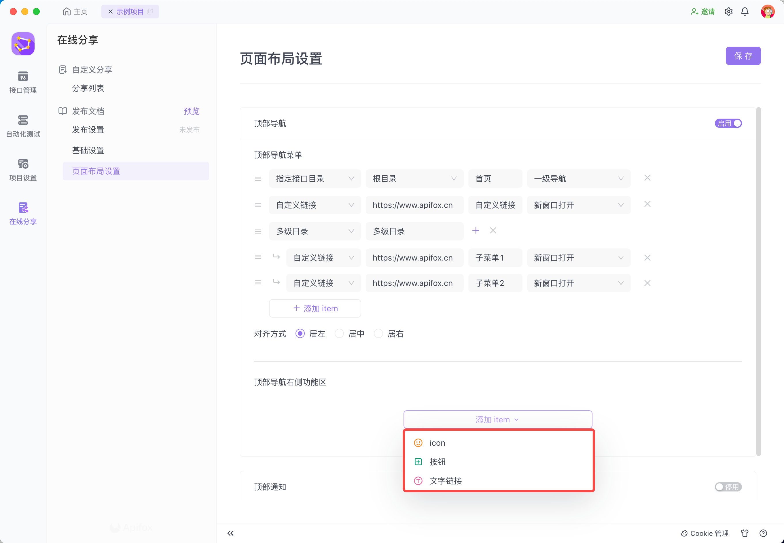 页面布局设置功能允许用户自定义 API 在线文档页,包括:添加导航功能,添加文档底部 banner,添加登录注册按钮等。