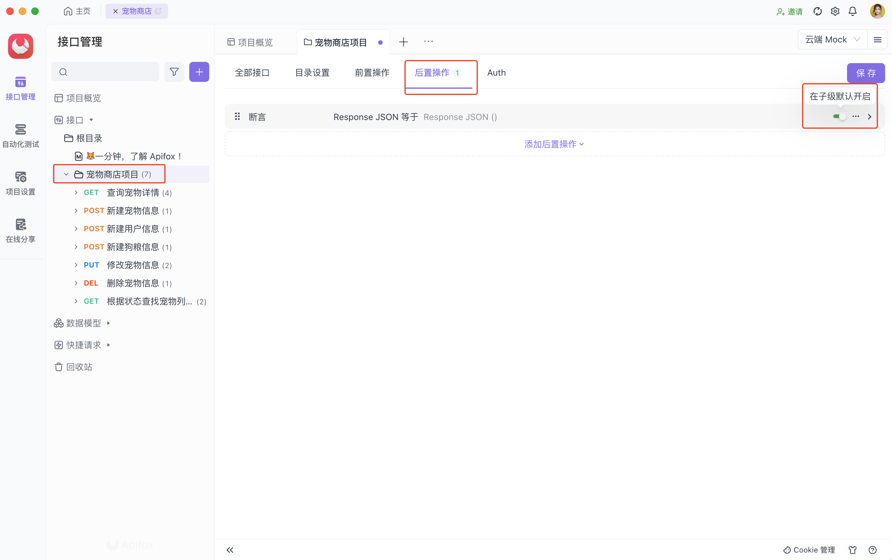 后置操作支持添加断言,可对接口返回的数据(或响应时间)设置断言,判断是否符合预期。查看断言功能文档