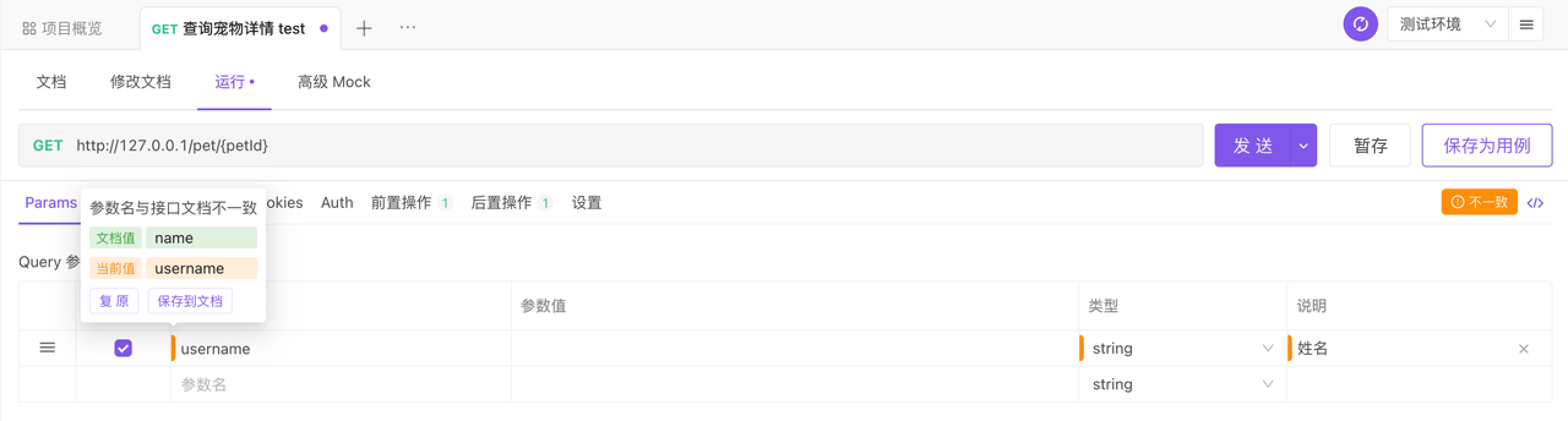 复原或保存到文档时,可以看到请求参数右上角有不一致文字,鼠标移动上去,根据需要选择。
