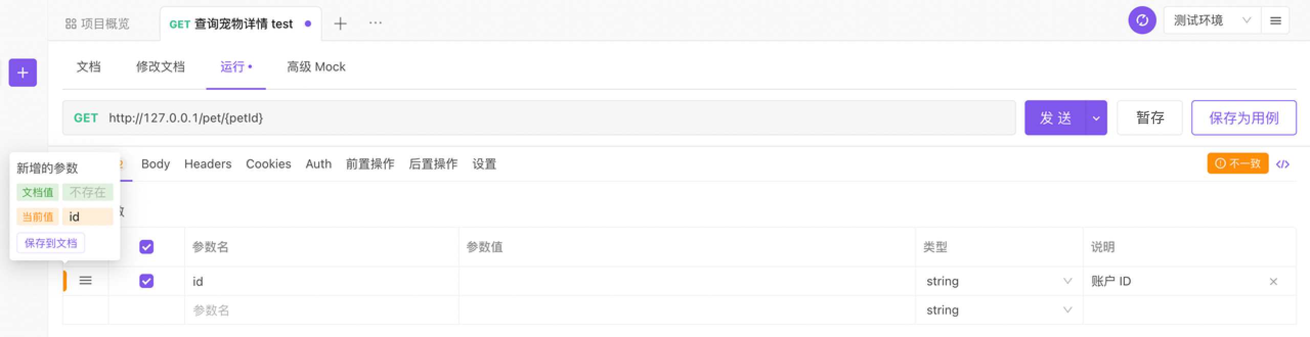 保存为用例,将填写的 参数值、前置脚本/后置脚本 等信息保存为接口用例,方便其他团队成员调用。 - 运行 页面与 接口用例 页面有自己不同的保存状态,运行页保存为用例时,运行页不会进行暂存。运行 页面会保存在账号维度,多端同步,其他成员看不到。