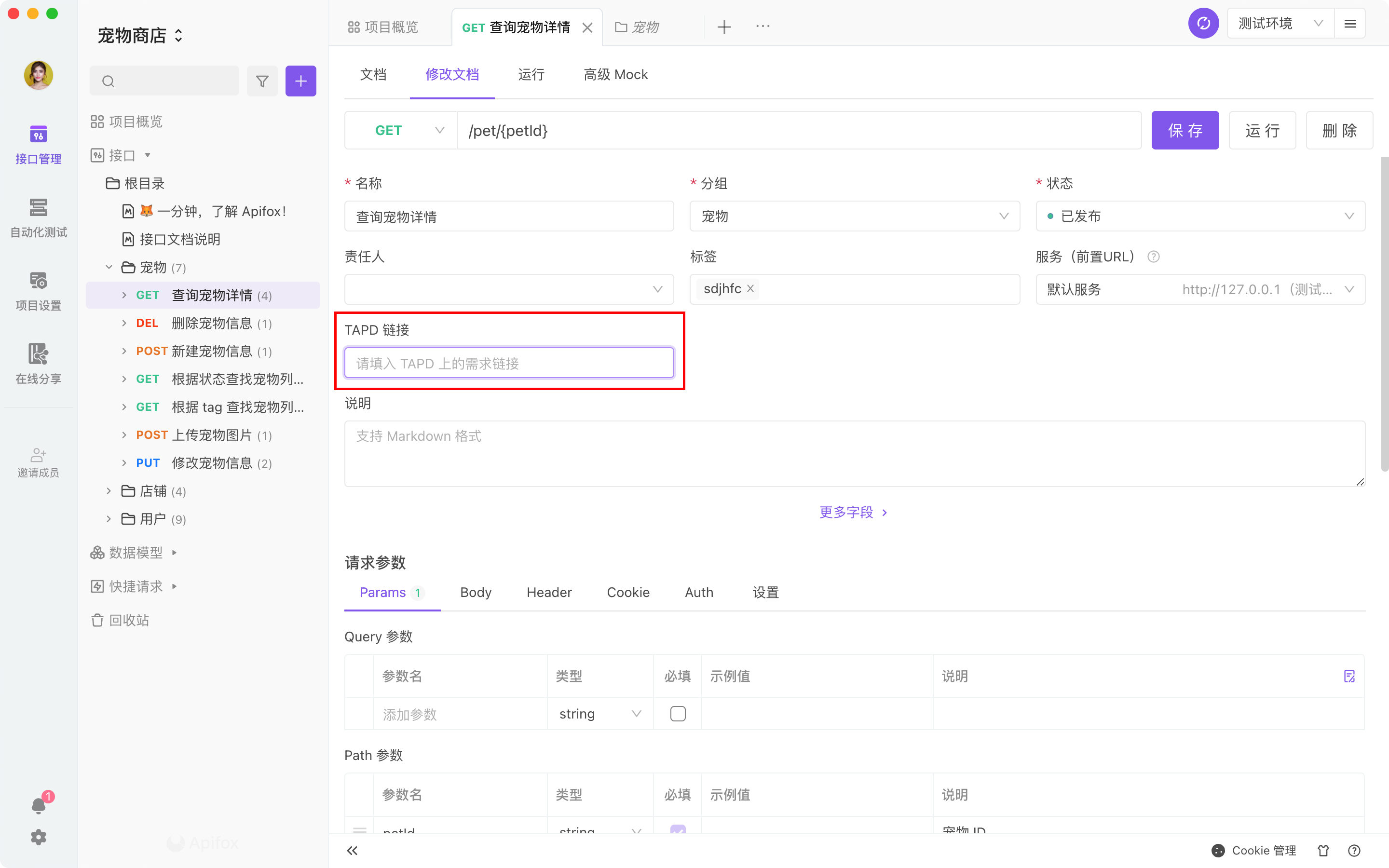 自定义字段功能,可以支持到项目管理者,可以根据自己的需要,设置接口文档的通用字段,比如:创建时间、TAPD 链接、需求文档链接等,更方便的管理项目
