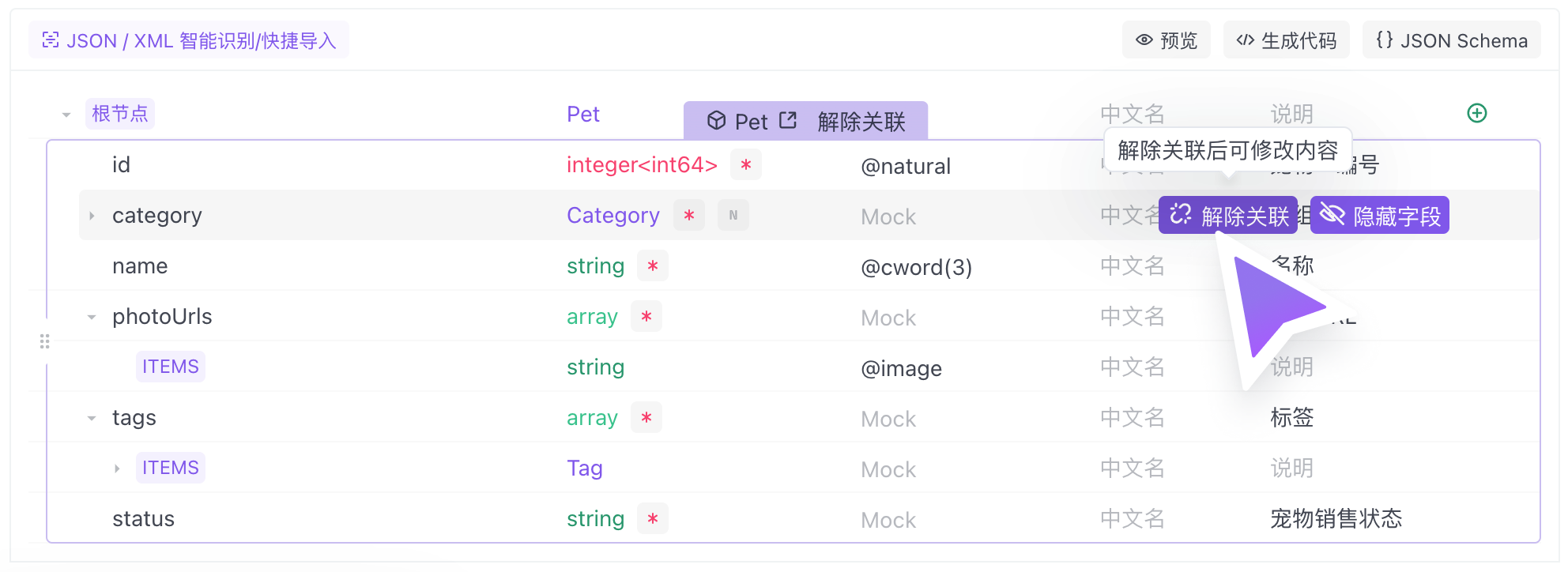 通过 JSON 数据自动识别生成数据结构,如果你已经有 JSON 数据了,这是一个快捷生成的方式。