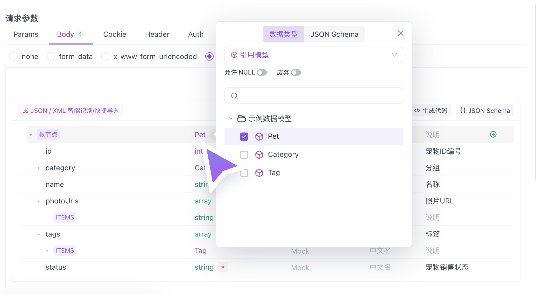在 接口设计 的返回响应和 json / xml 类型的Body 参数处,在数据类型处可以引用已经建立好的数据模型,如下图。