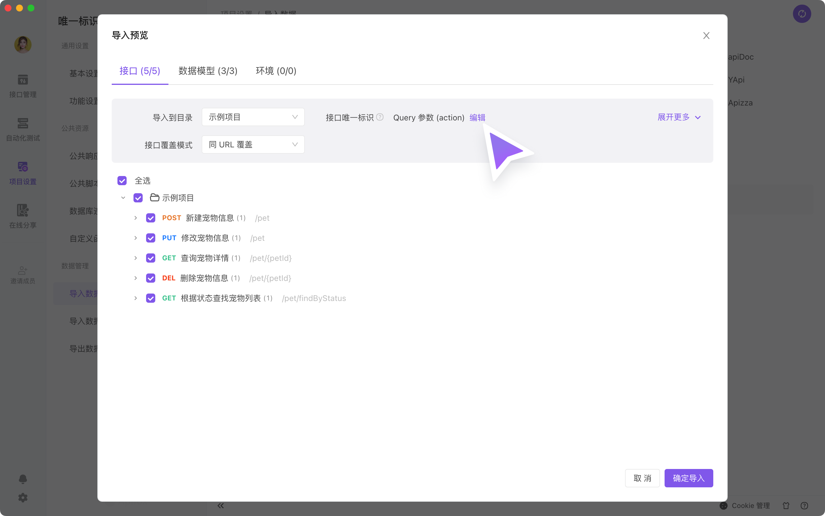 当你的项目中已经是通过 Query / Header 中的参数来区分接口,通过 OpenAPI 格式 的文件导入 Apifox 时,如下页面。