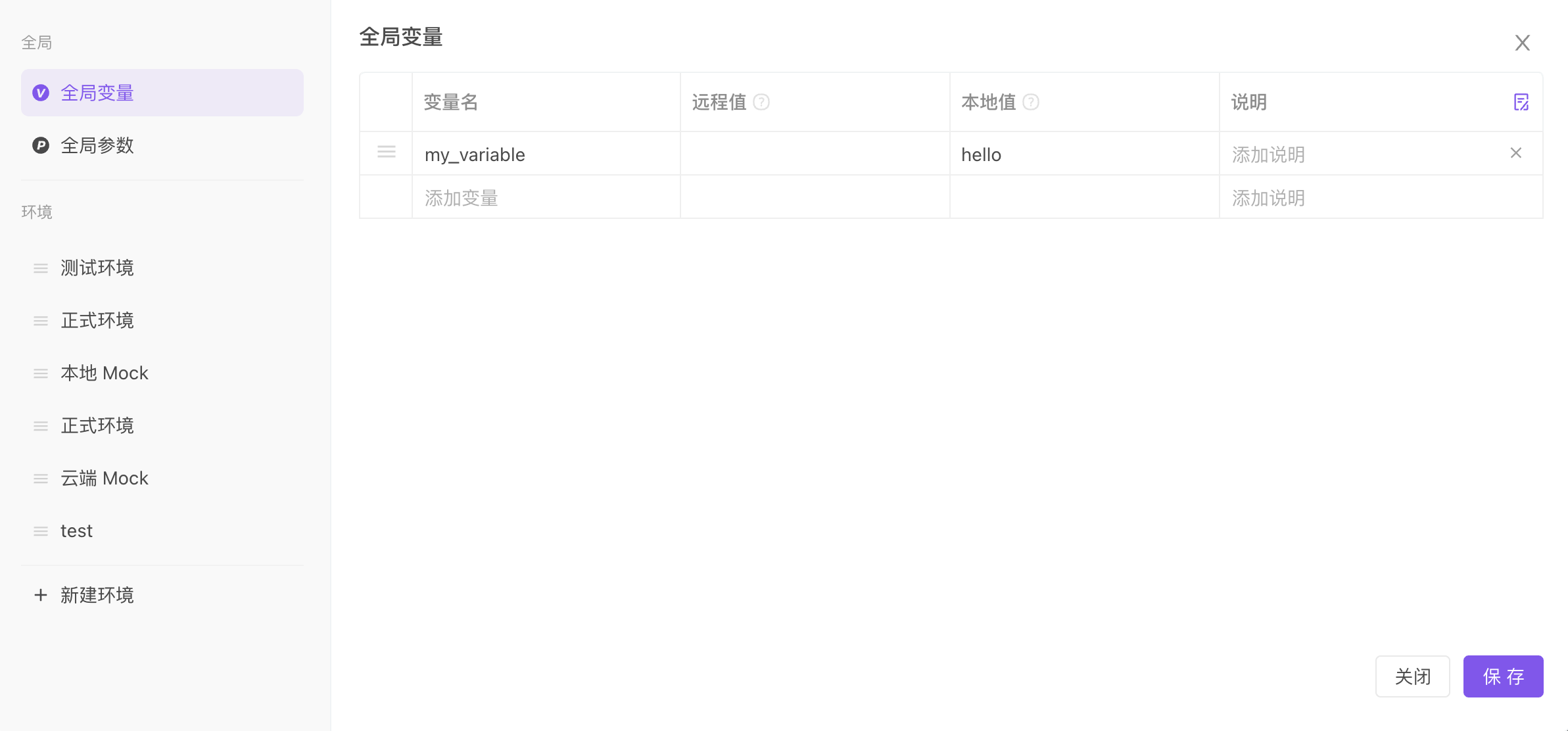环境管理模块设置,查看文档:环境管理 - 全局变量 使用方法类环境变量类似,但全局变量不会跟随环境切换而改变。
