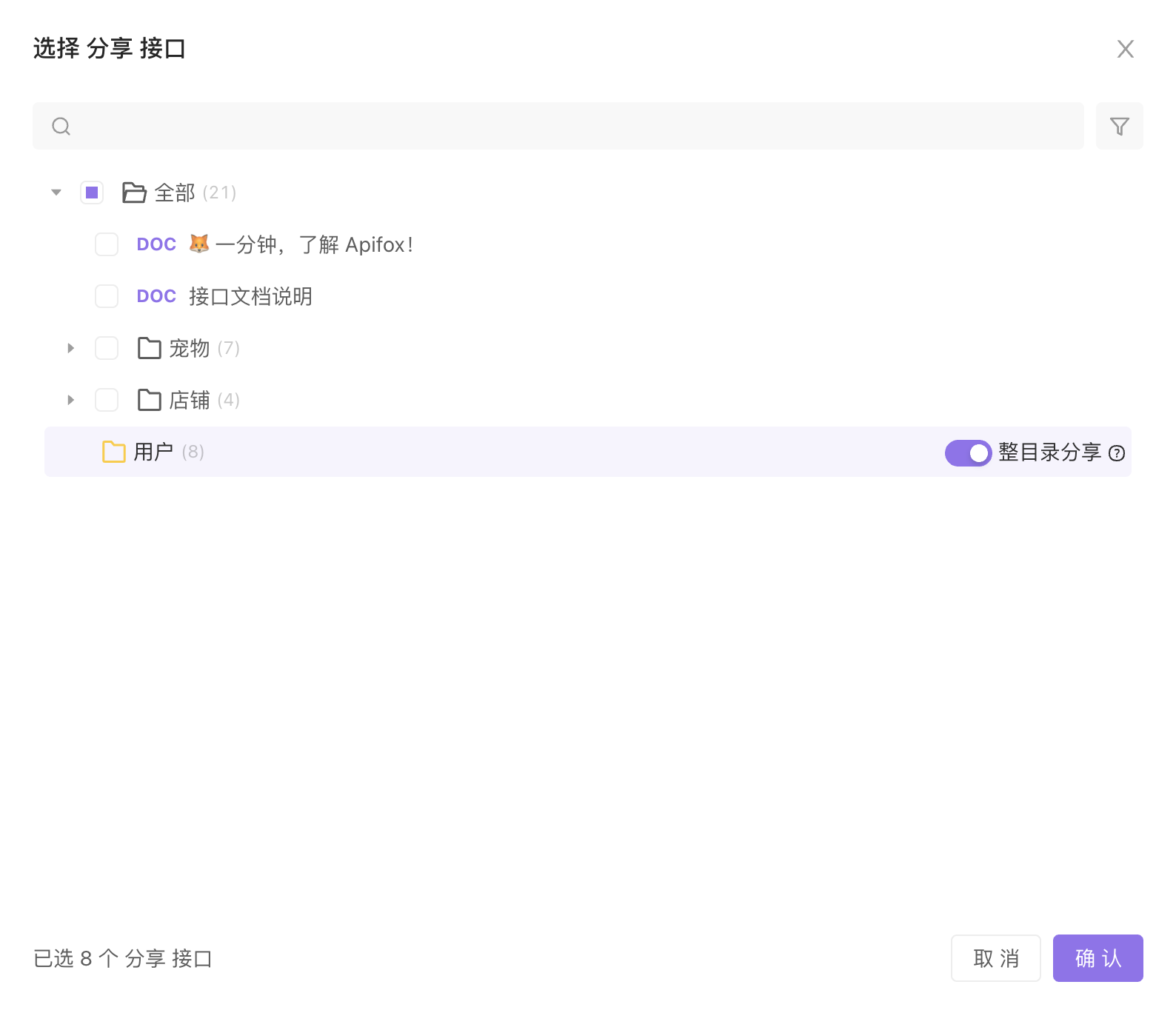 - 分享范围:可以选择项目全部,也可以选择部分接口,也可以根据标签维度导入