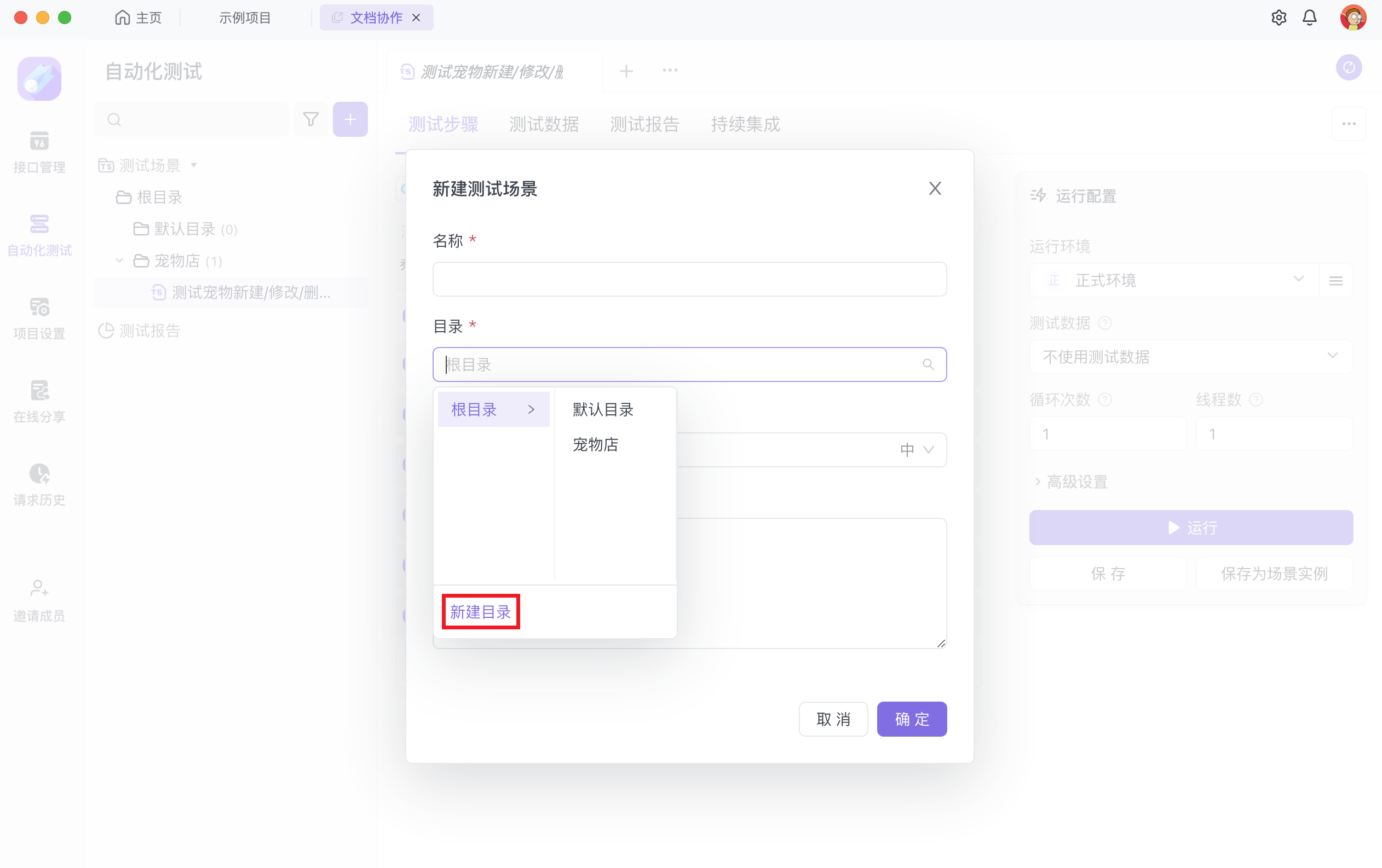 若希望调整测试场景的所在目录,可以在创建测试场景时点击“目录”中的“新建目录”按钮或选择已有目录并进行调整。