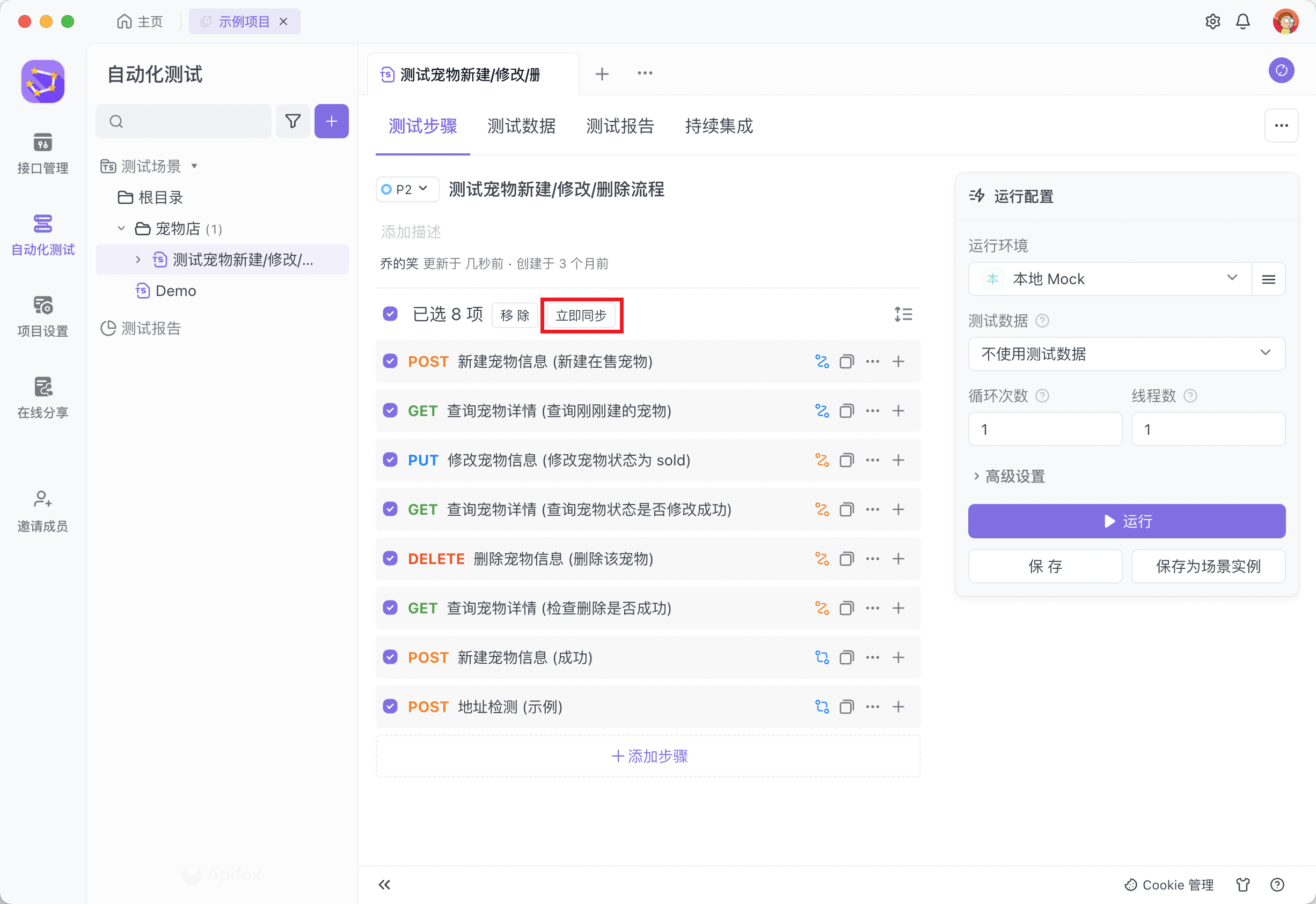 若当前测试步骤中的大部分数据都采用了手动同步模式,而测试人员已经确认这些接口文档/用例的数据无误,希望将数据快速同步至测试步骤中,那么可以在测试步骤页点击“立即同步”按钮执行批量同步操作。