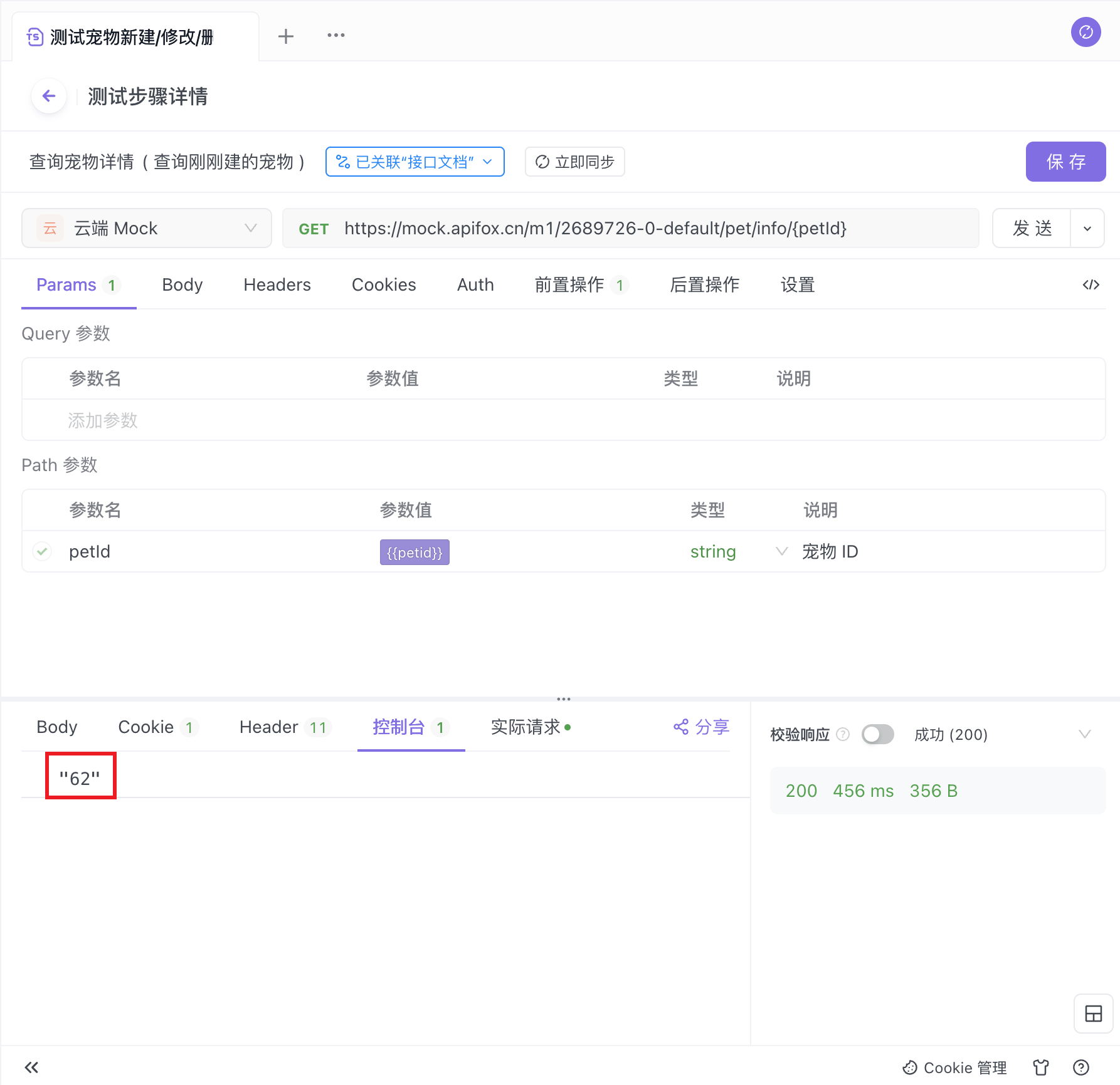 在 B 接口中的请求参数中直接填写 {{petId}},即可在请求参数中直接引用 A 接口所返回的值。