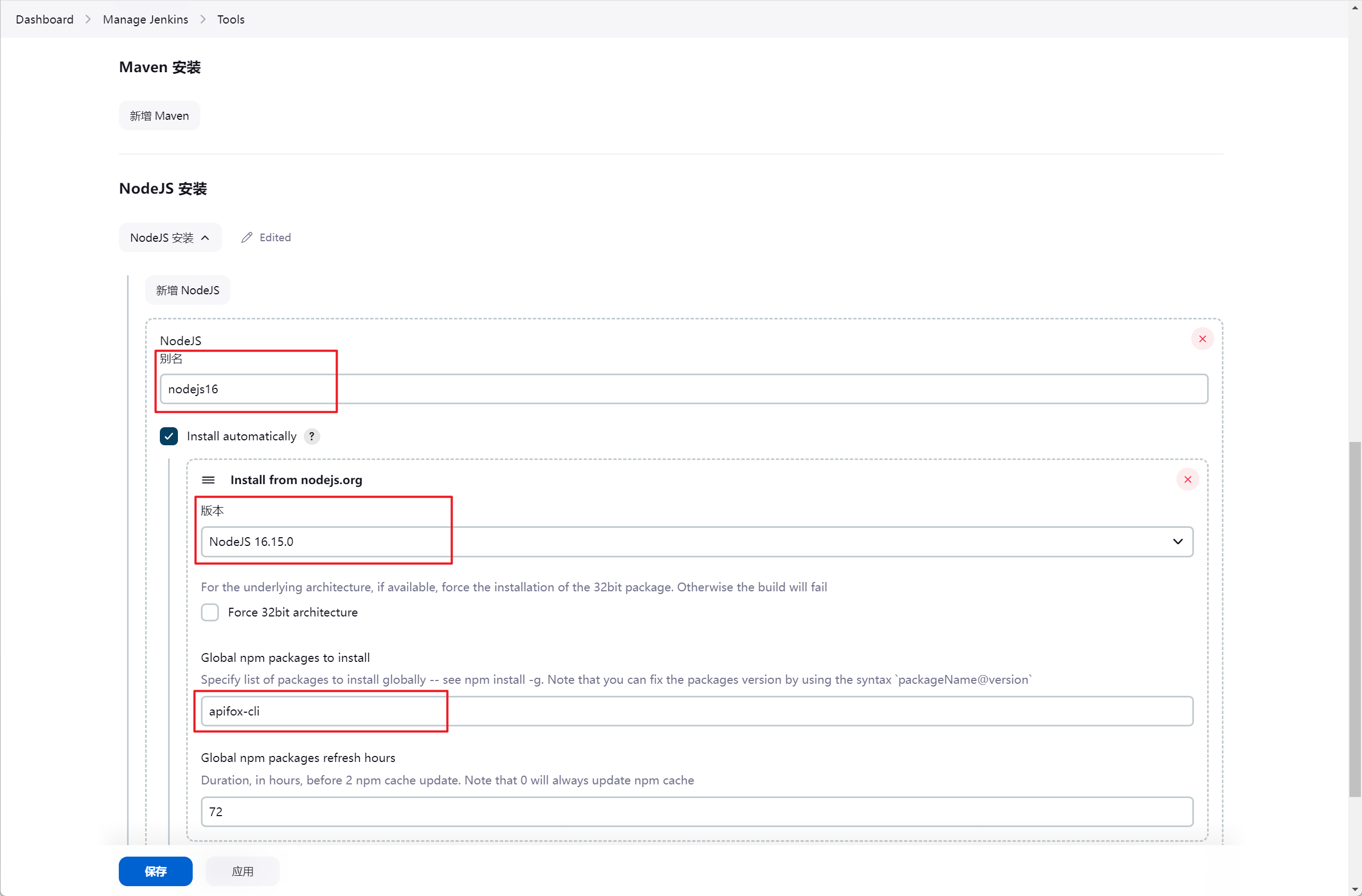 运行 Apifox CLI 前需确保 Node.js 版本号 >= v14.20.1,因此需要先在 Jenkins 环境中配置 NodeJS 依赖。