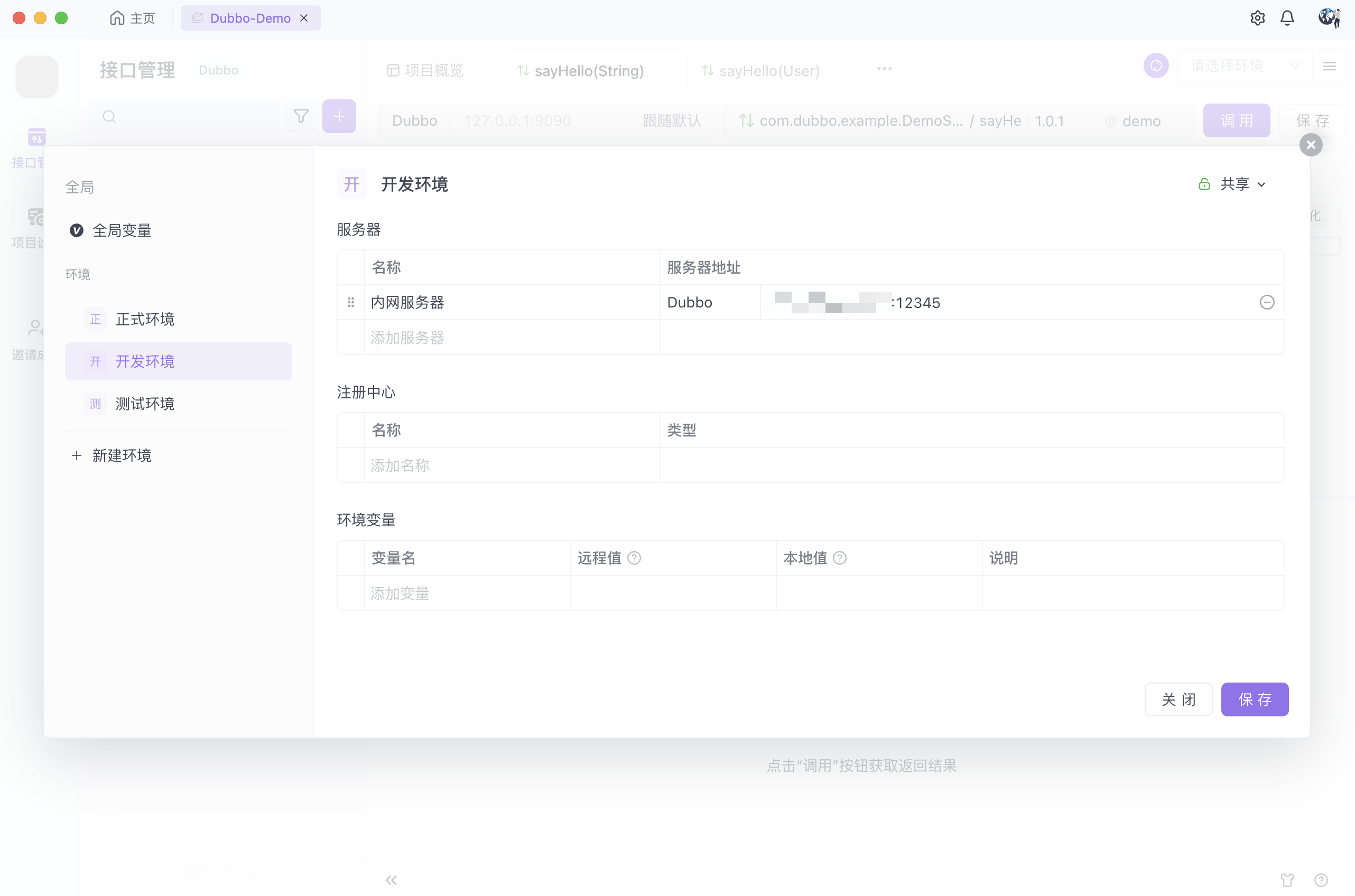 如果需要单独为每个 Dubbo 接口设置不同的服务器地址,可以点击接口地址栏,选择环境并手动切换服务器地址。
