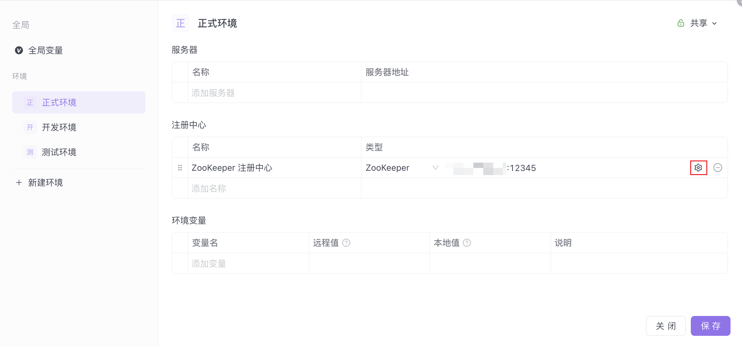 填写注册中心名称,选择类型并填写地址。若注册中心配置了鉴权机制,请点击右侧齿轮按钮并进行高级配置。