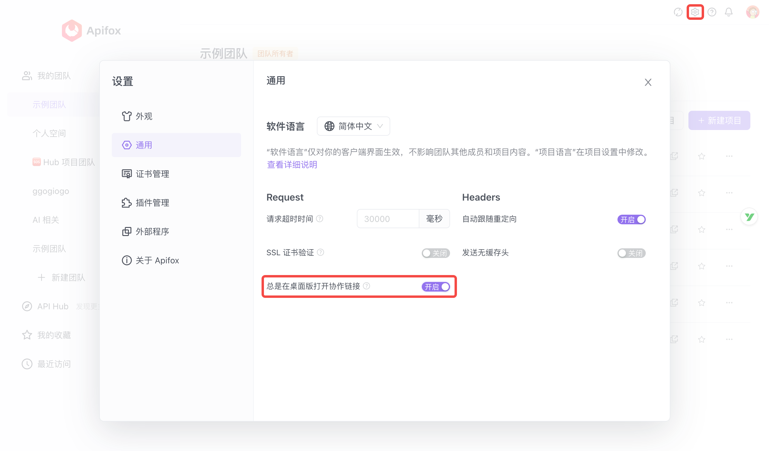 协作链接支持在客户端和 Web 端中打开。若你希望通过客户端定位接口,前往 Web 端,轻点「设置」⚙ 图标,在「通用」处开启「总是在桌面端打开协作链接」按钮。